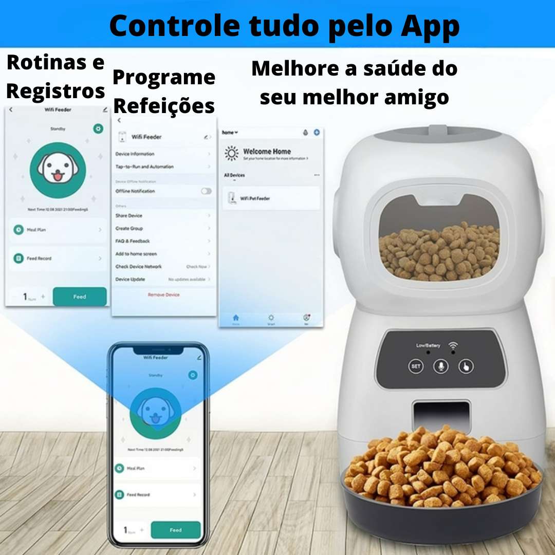 📱 Controle Remoto por App: Alimente seu cão de qualquer lugar, a qualquer momento, usando seu smartphone. Está preso no trânsito? Não se preocupe, seu cão não ficará com fome